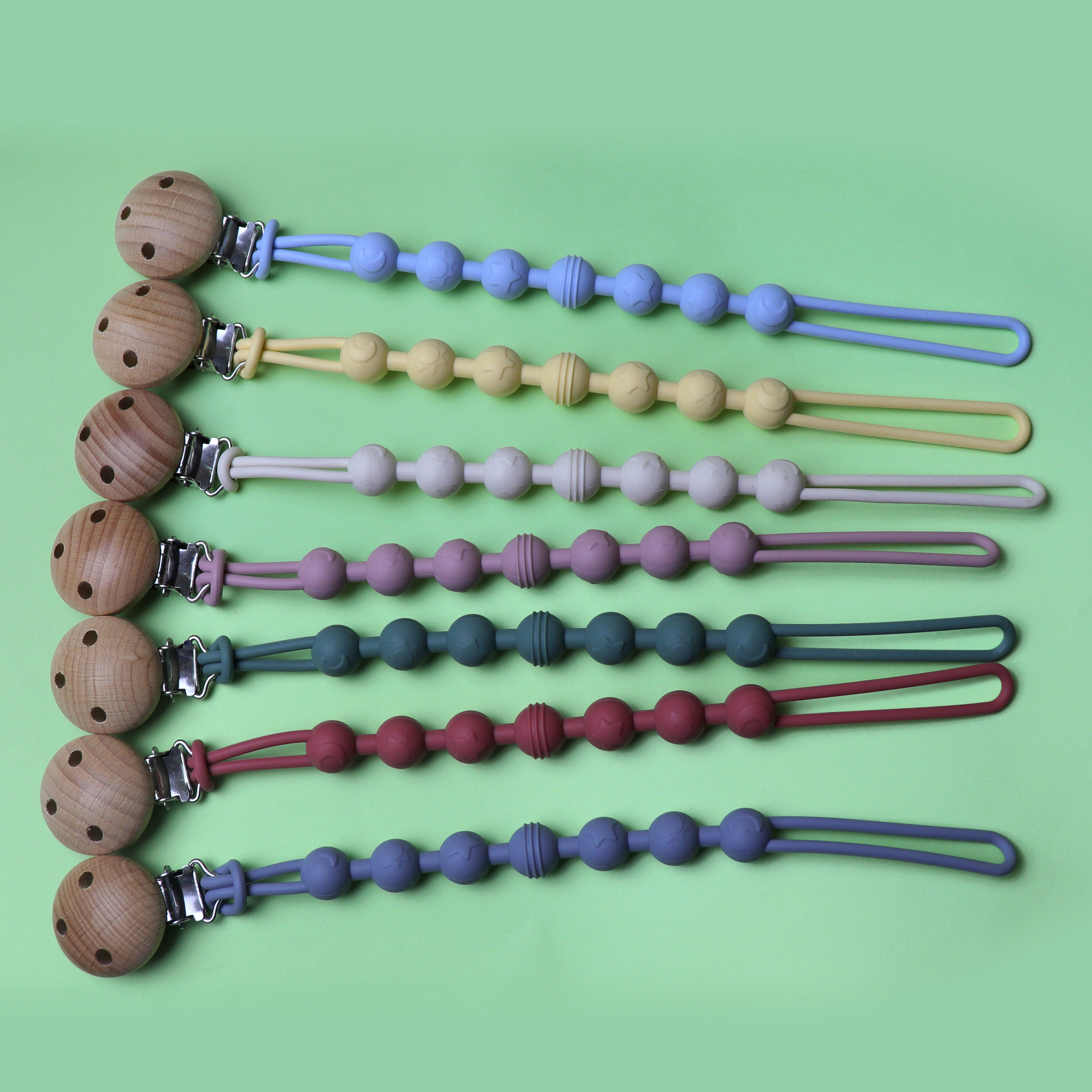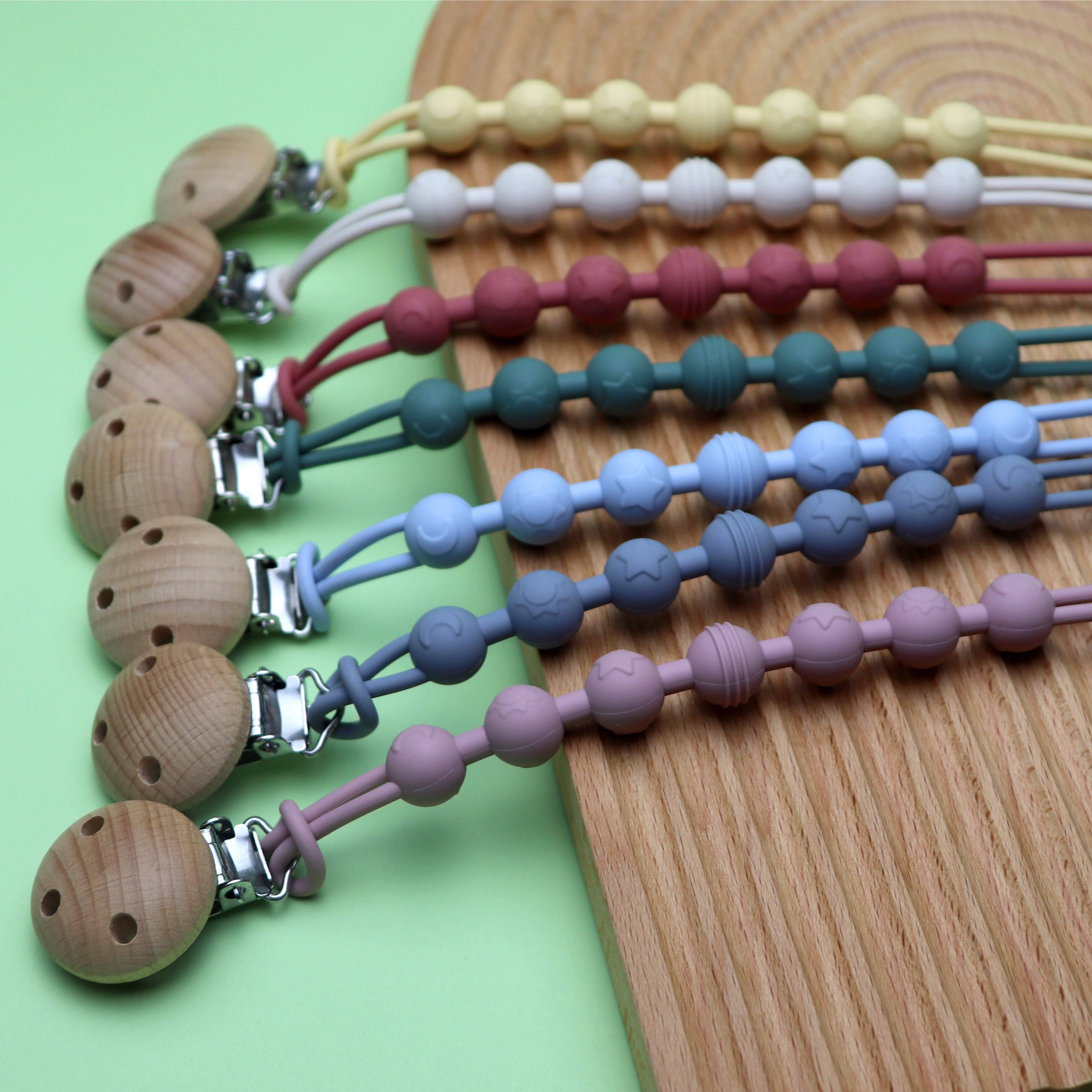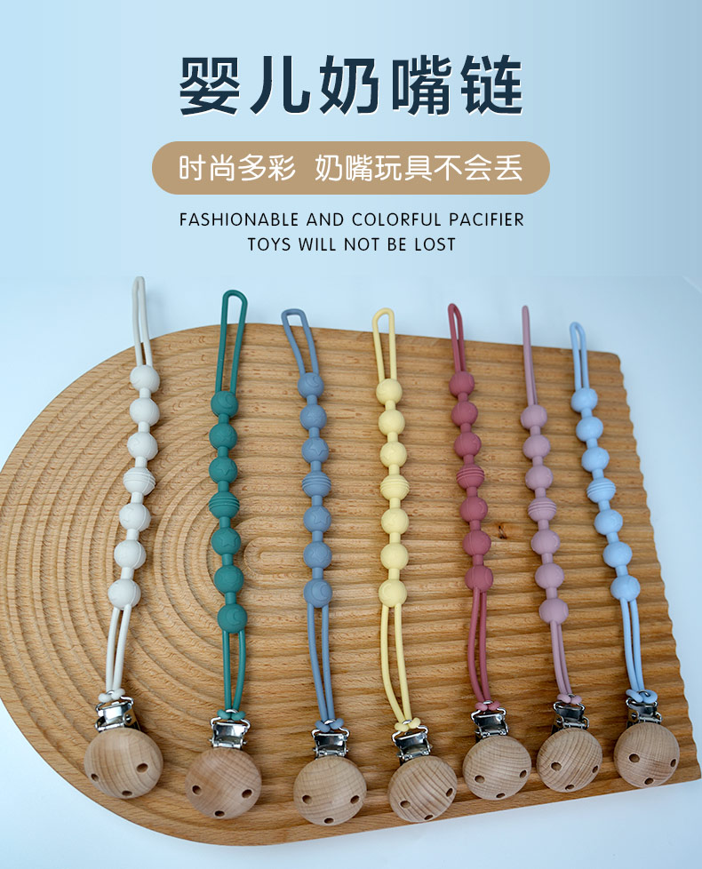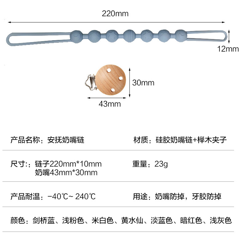 材質(zhì):硅膠奶嘴鏈+櫸木夾子